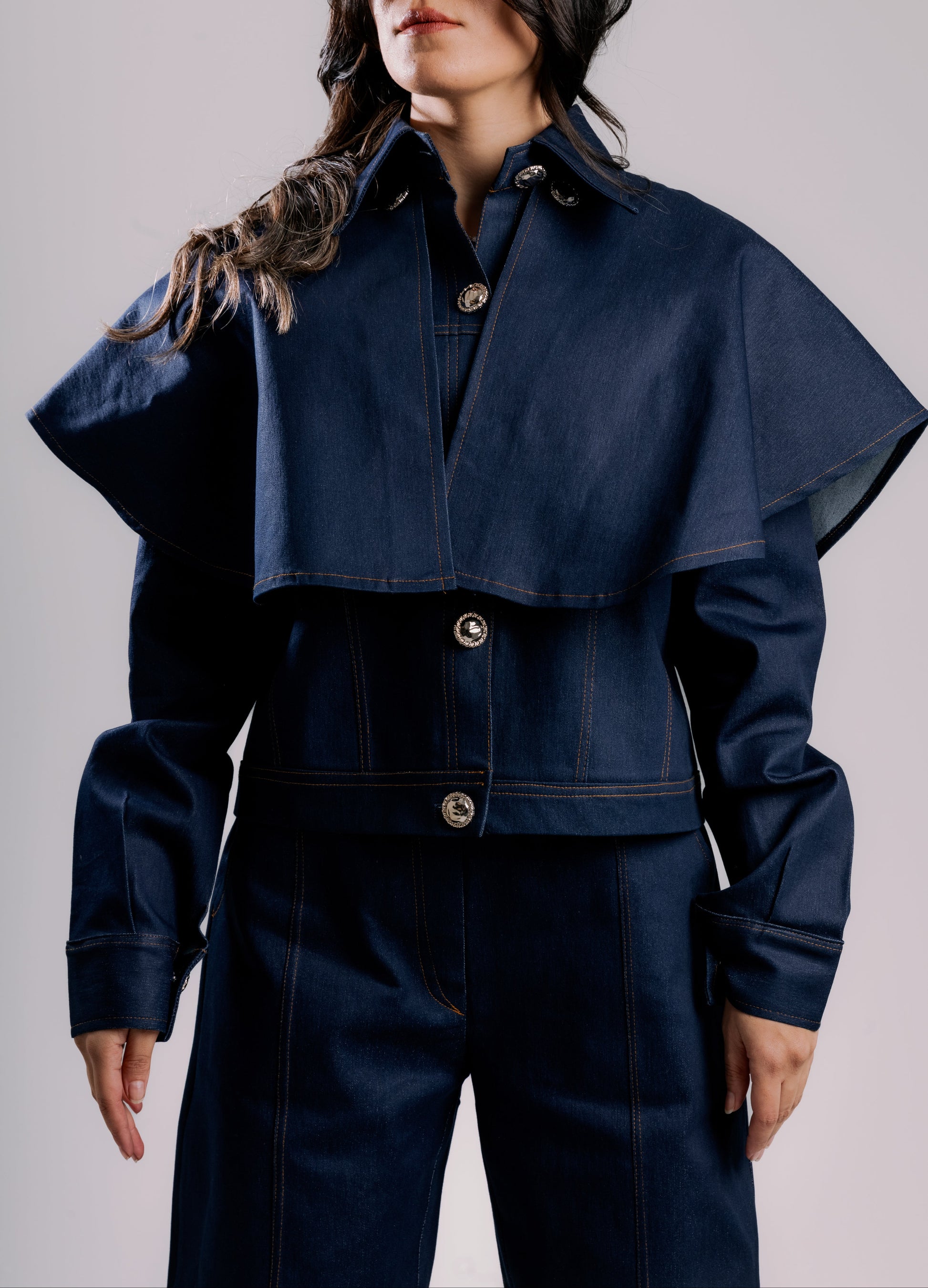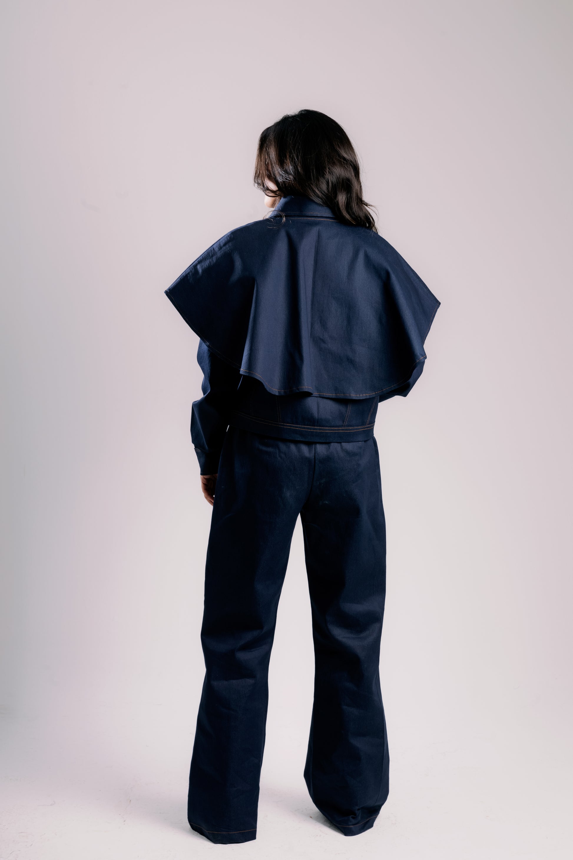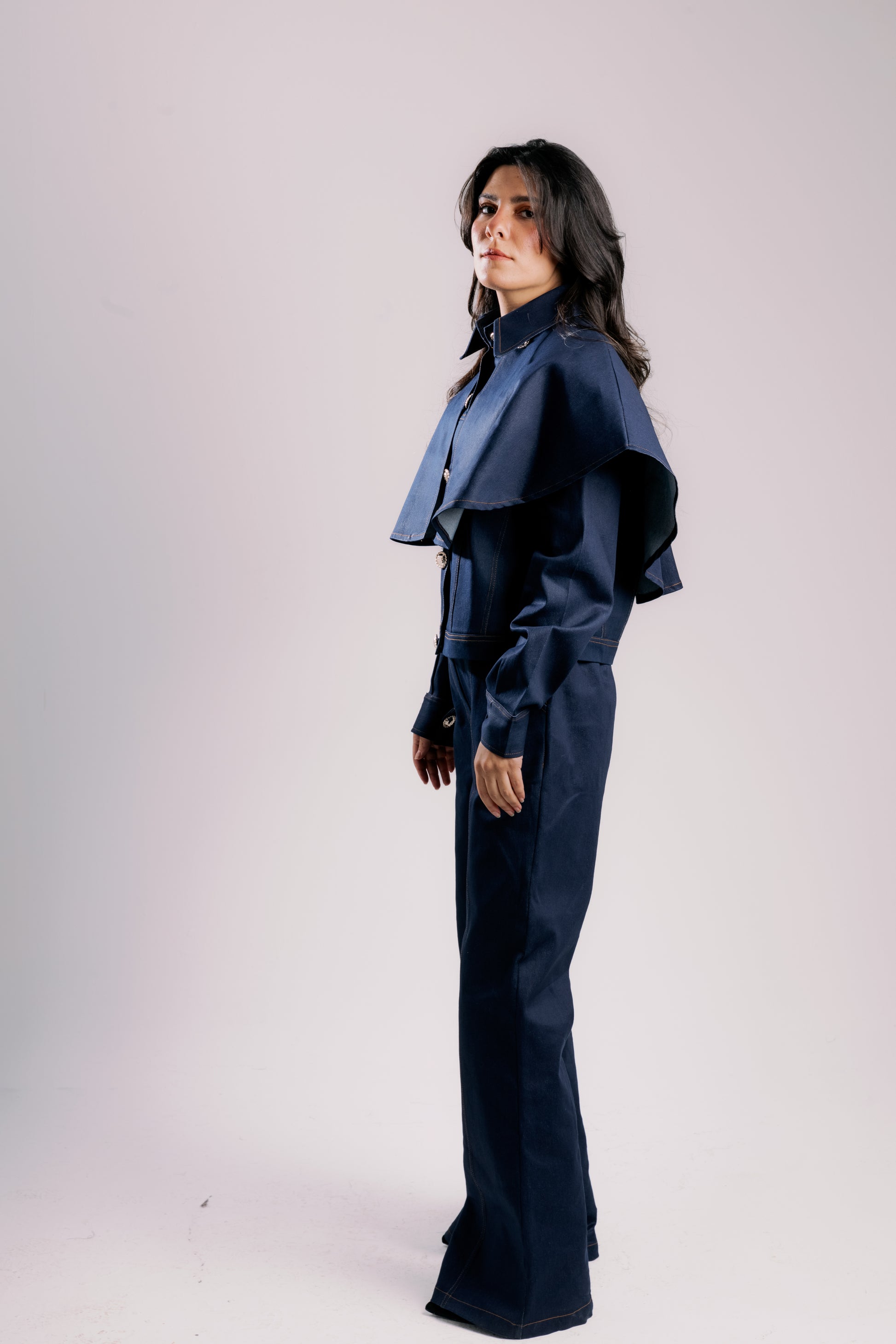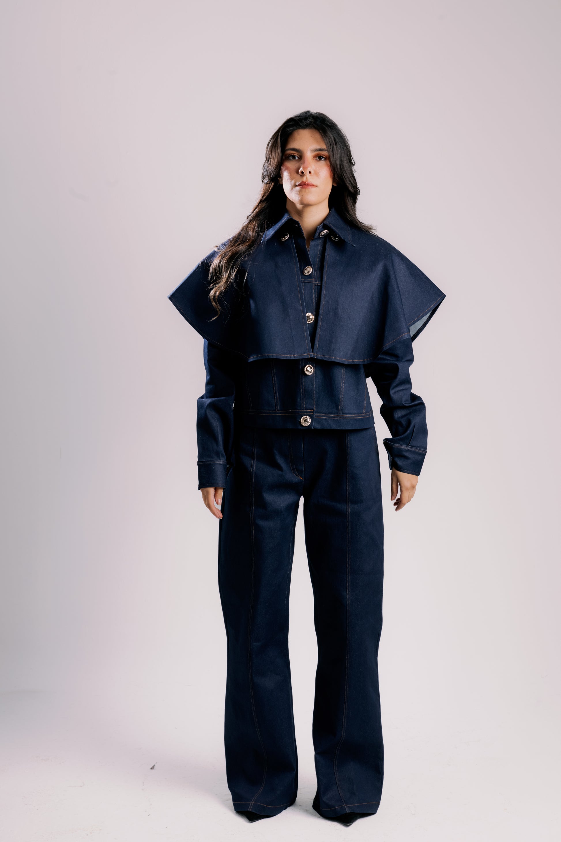 Redefining denim with purpose, The Power Pair brings confidence to everyday dressing. The cape-collared jacket and structured straight-leg with light flare trousers strike the perfect balance between strength and simplicity. A statement denim set that anchors a modern wardrobe with a removable cape for versatility.