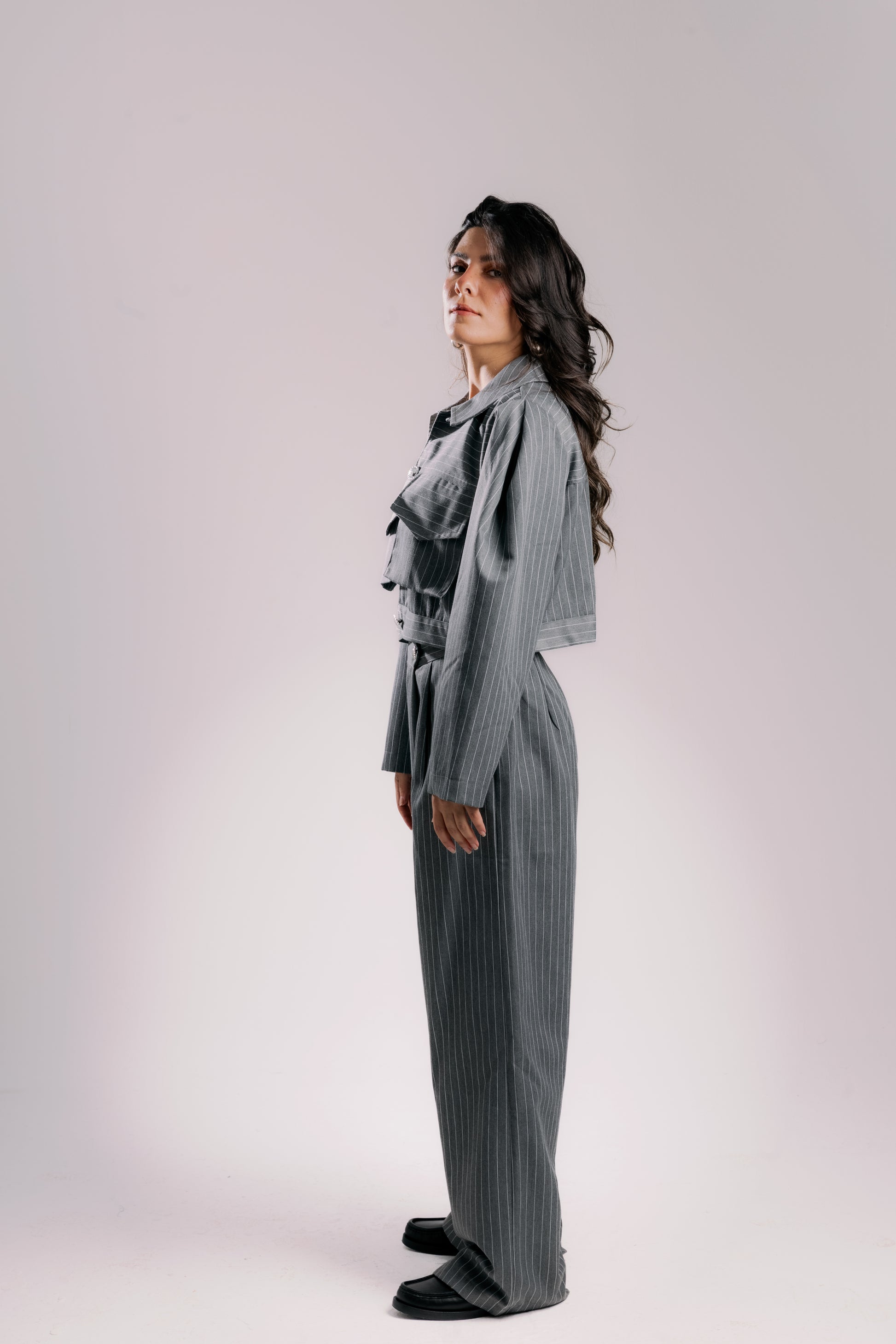 The Signature defines the Dalamo silhouette, strong lines, soft power. The cropped pinstripe jacket and wide-leg trousers create sculpted proportions that flatter without effort. It moves from work to evening with timeless grace. Wear it as a set or separate.