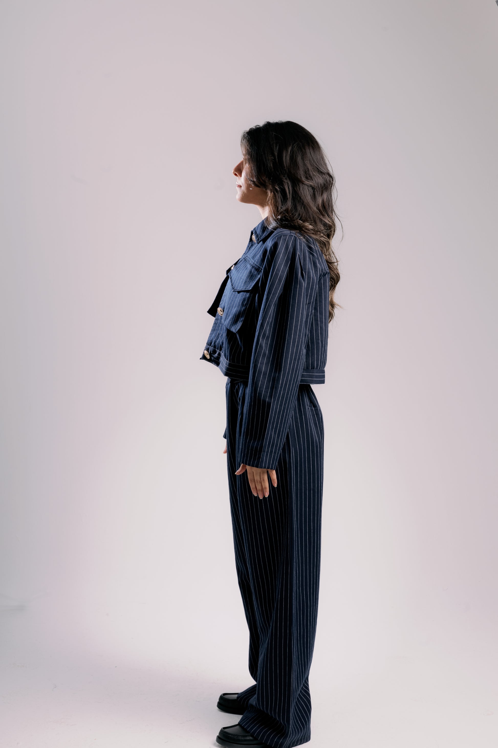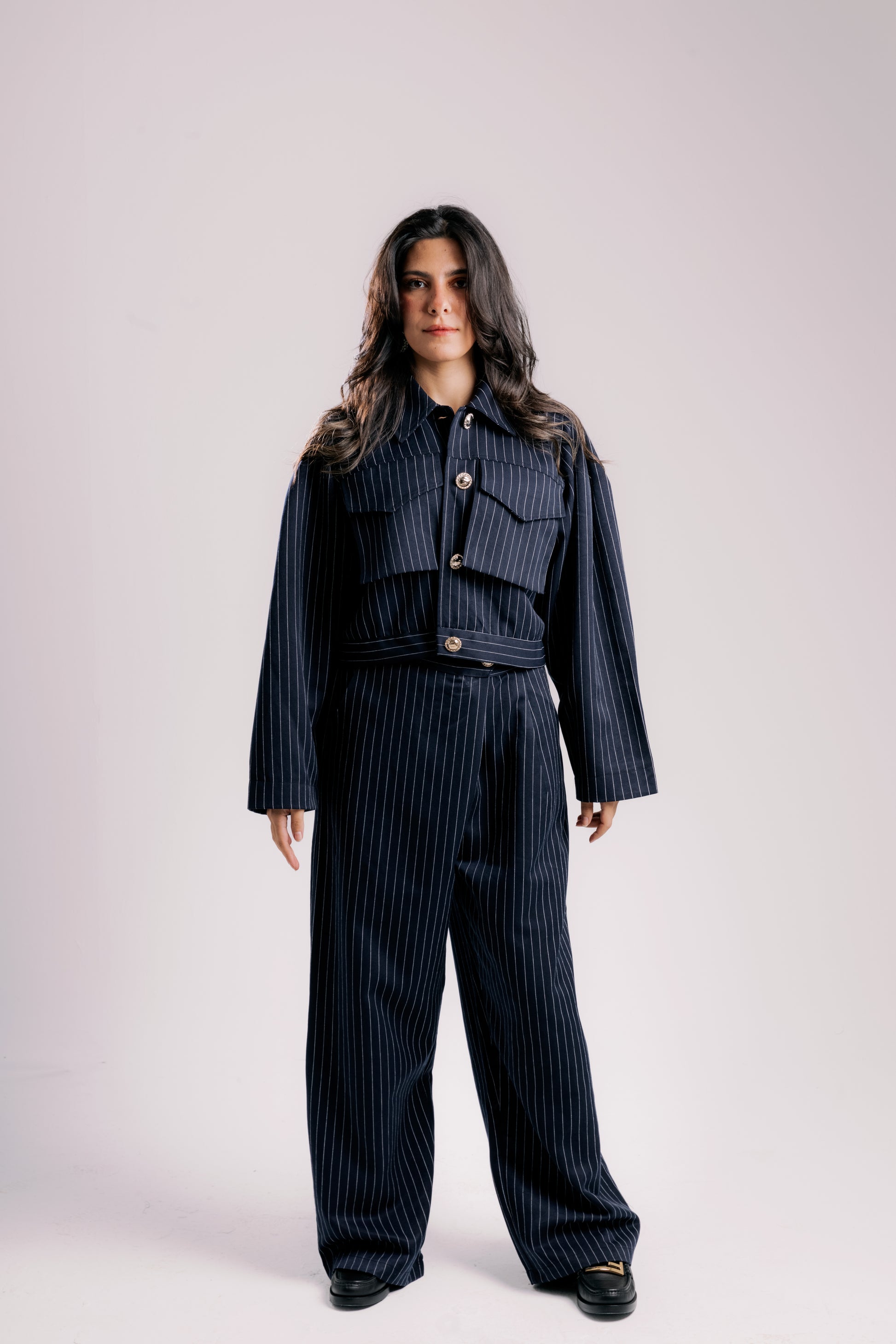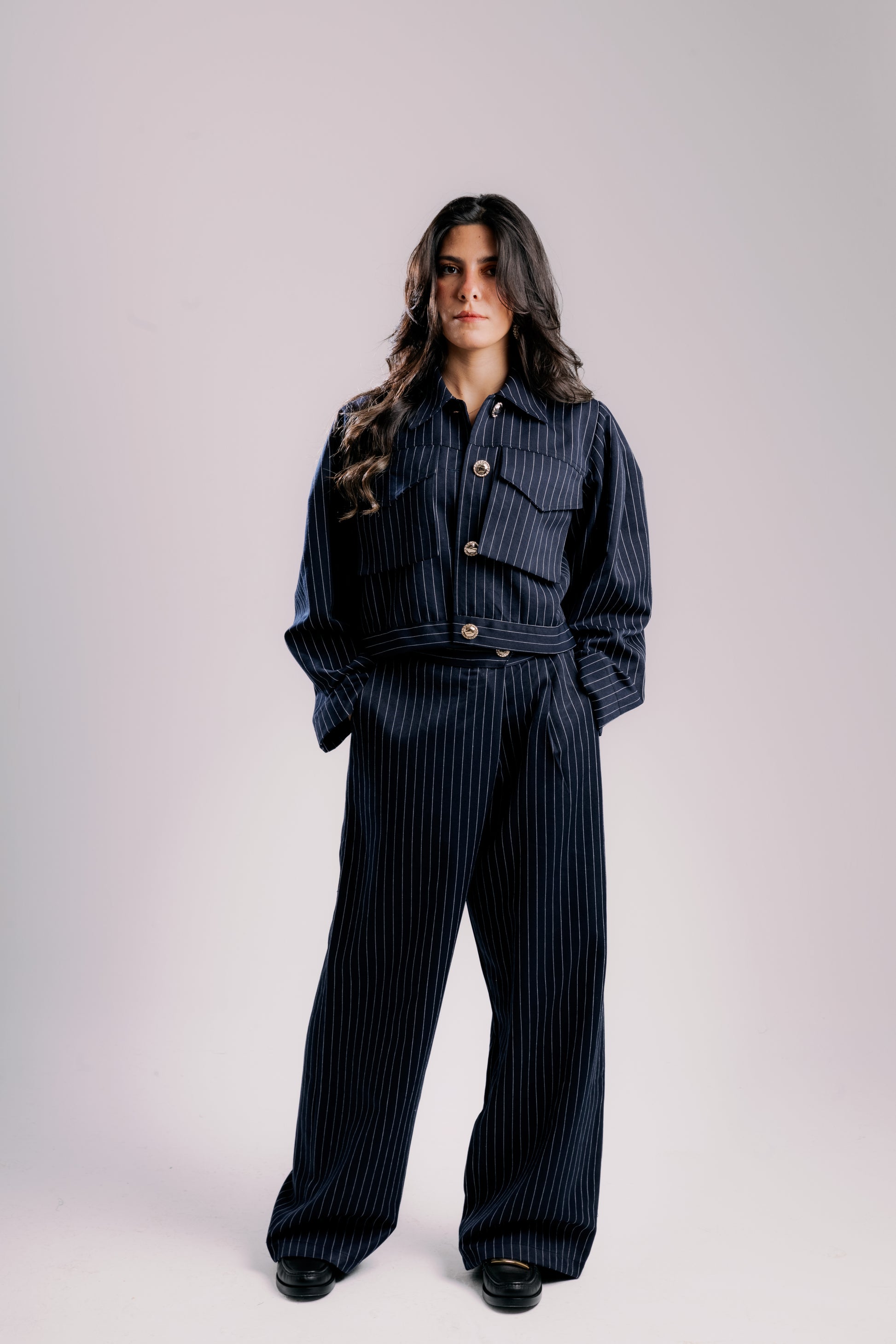 The Signature defines the Dalamo silhouette strong lines, soft power. The cropped pinstripe jacket and wide-leg trousers create sculpted proportions that flatter without effort. It moves from work to evening with timeless grace. Wear it as a set or separate.